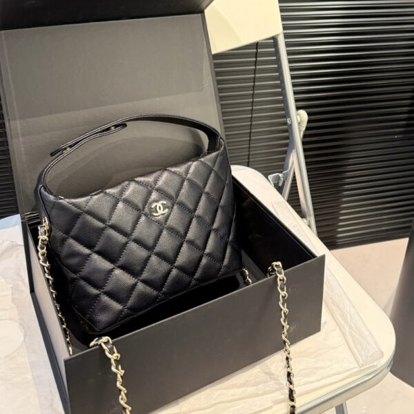 The Chanel 25C Hobo Bag in black radiates timeless elegance with its sleek curves and iconic quilting. A true symbol of modern prestige, it effortlessly elevates your style with a touch of Parisian sophistication.