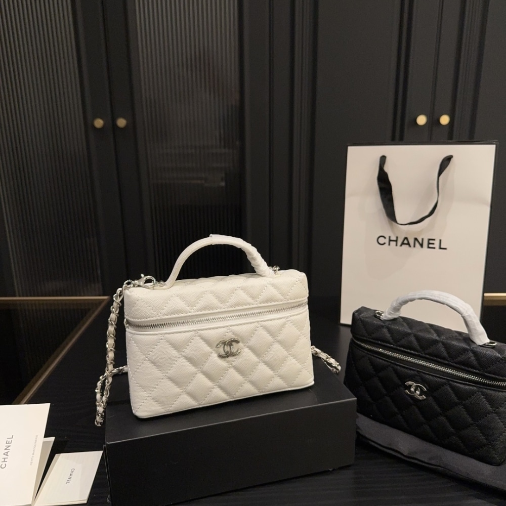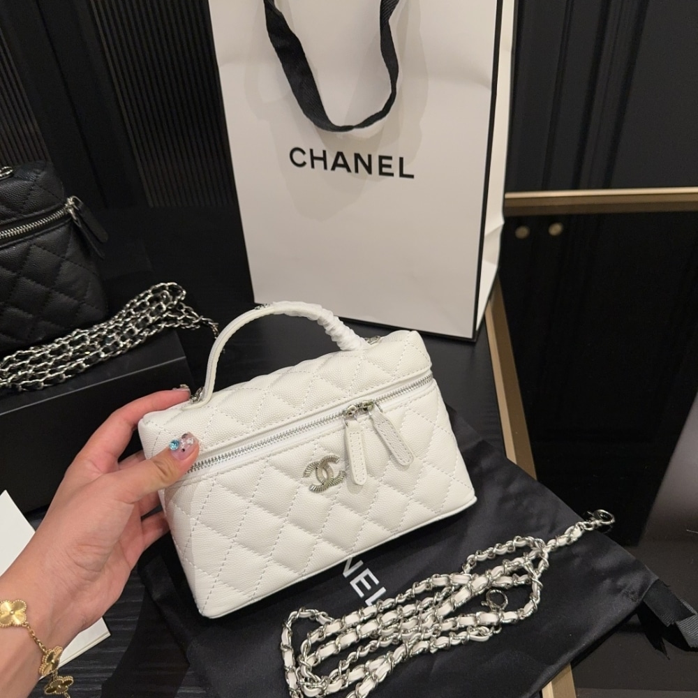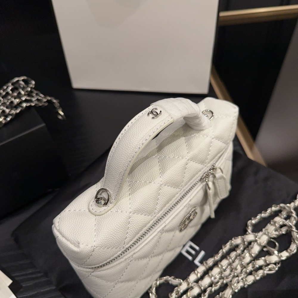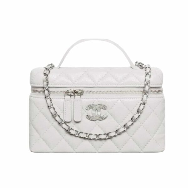 The Chanel 25C Matelasse Vanity in white exudes timeless elegance with its structured silhouette and luminous quilting. A true emblem of refined luxury, it elevates every ensemble with effortless sophistication and iconic allure.