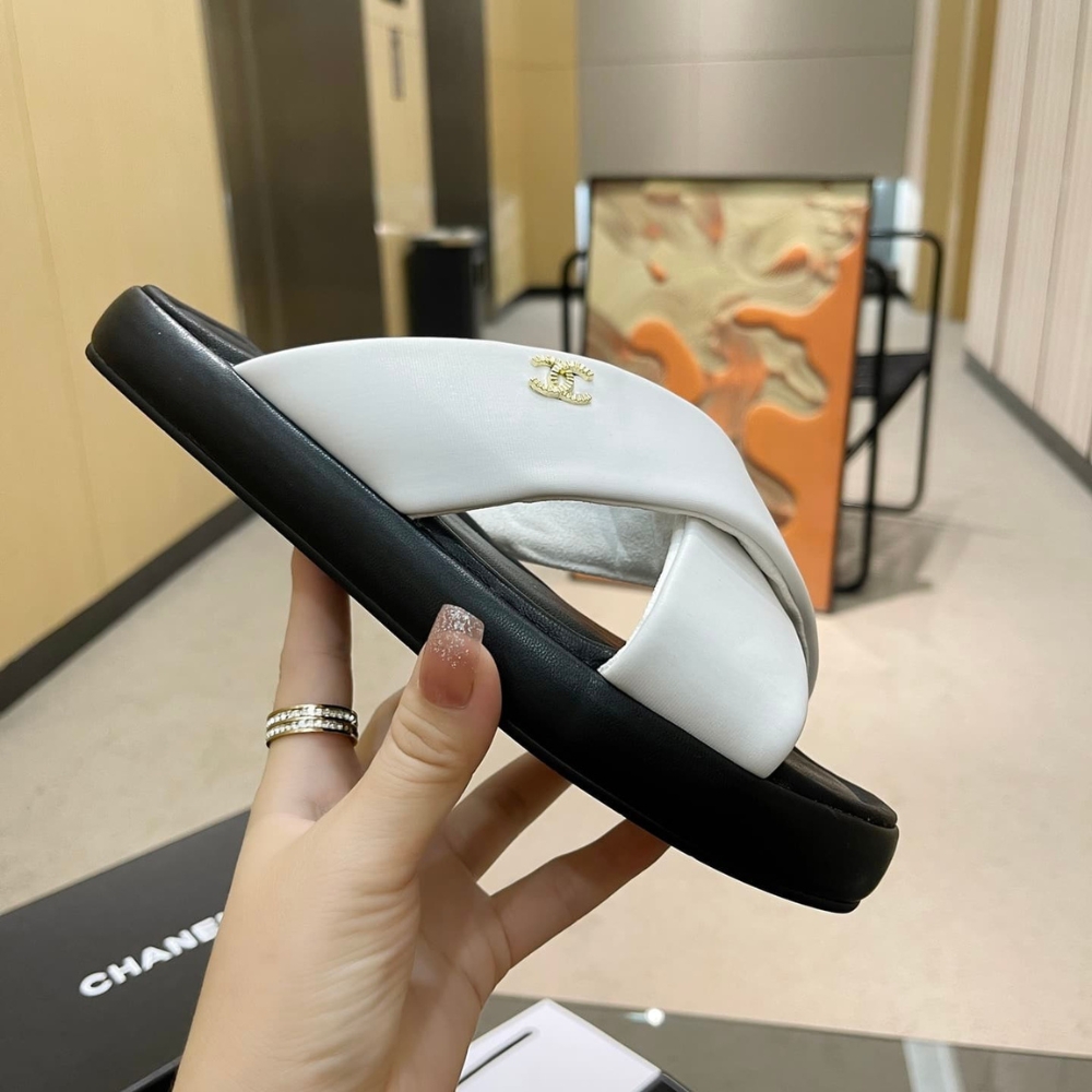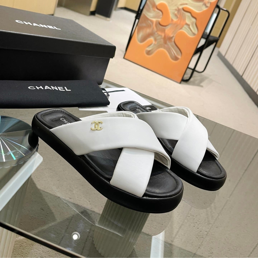 Chanel CC Logo Criss Cross Slides White