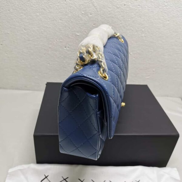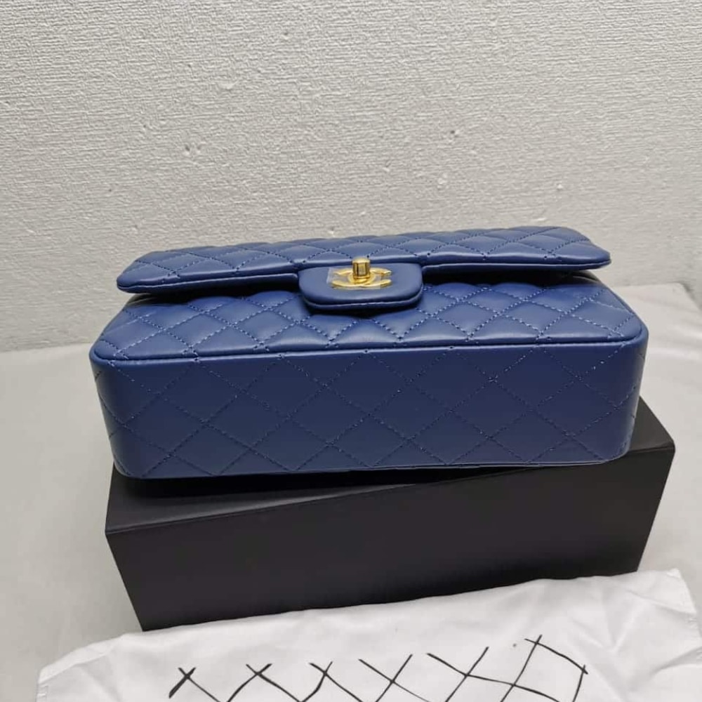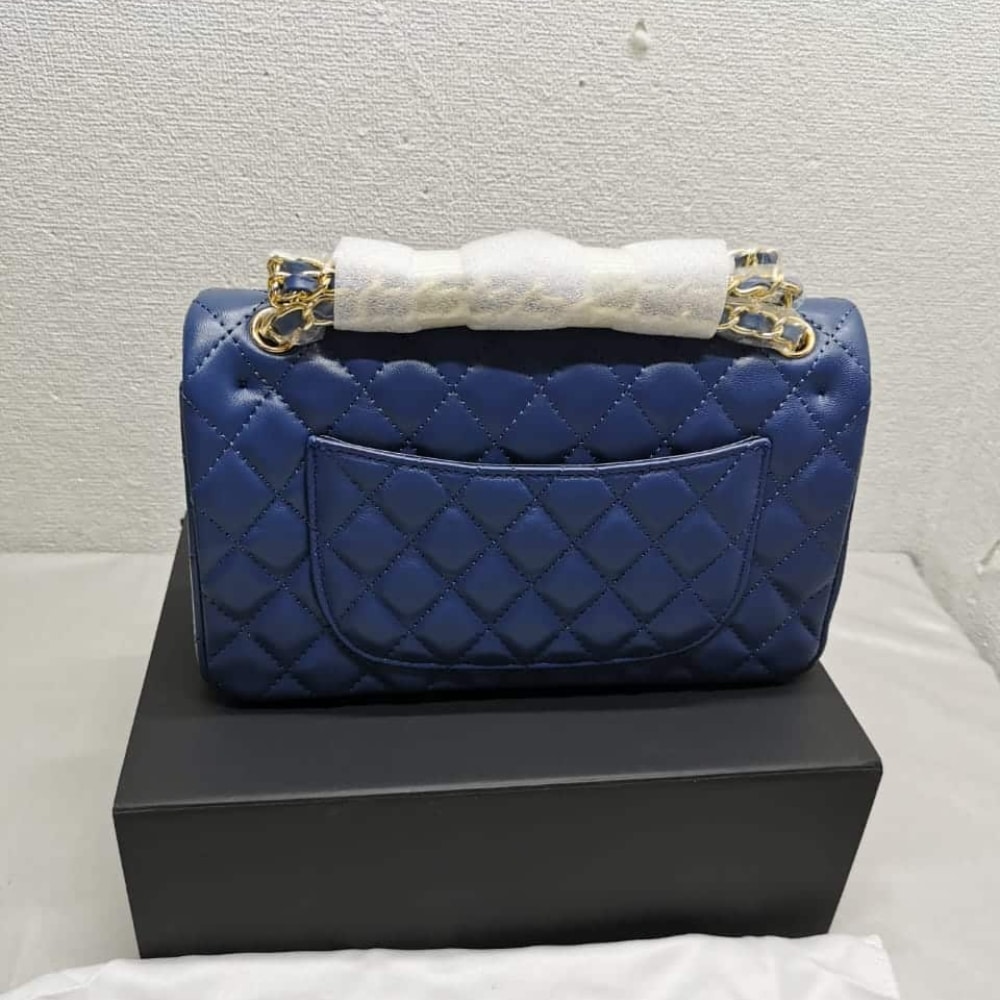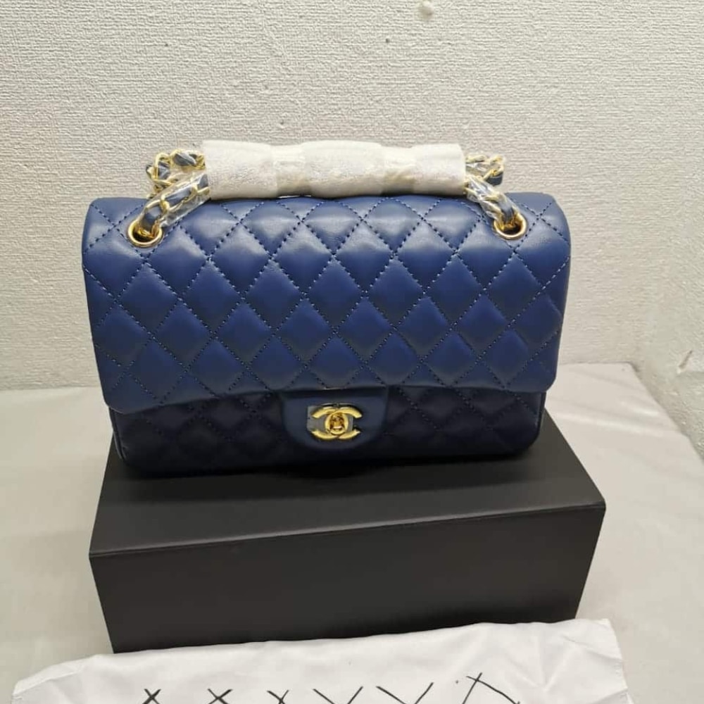 The Chanel Classic Medium Flap in navy with gold hardware exudes timeless sophistication and bold allure. With its iconic quilting and radiant accents, it stands as a coveted symbol of prestige and refined style.
