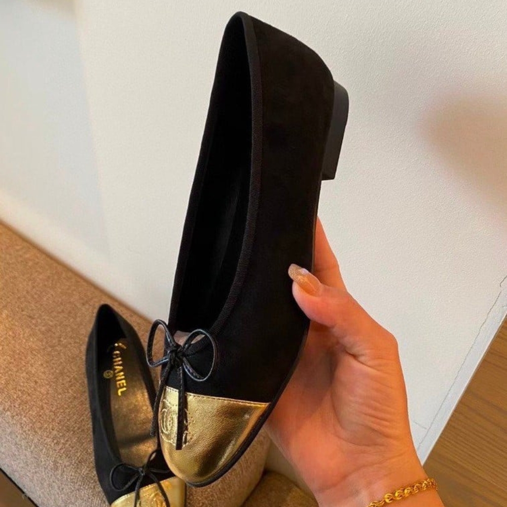 The Chanel Cap Toe Ballet Flats in black and gold exude timeless elegance with a touch of radiant allure. With their refined silhouette and iconic detailing, they embody effortless sophistication, elevating every step into a statement of prestige and style.