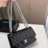 The Chanel Medium Classic Double Flap in black with silver accents radiates timeless elegance with a modern, striking allure. Its iconic quilting and luminous CC clasp affirm prestige, making it a coveted statement of sophistication and style.