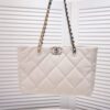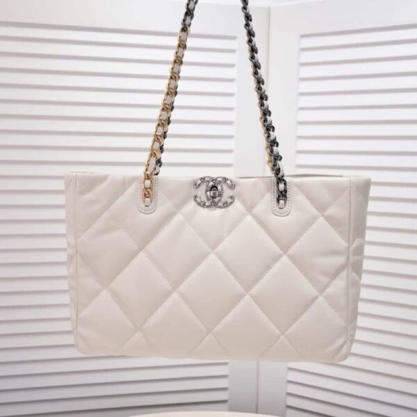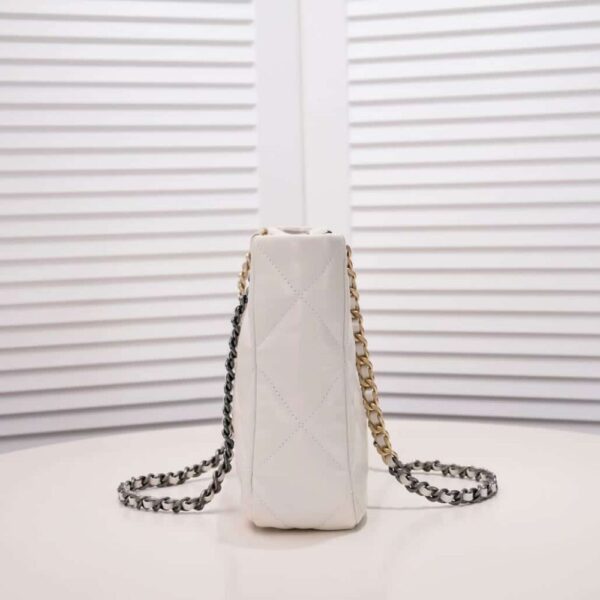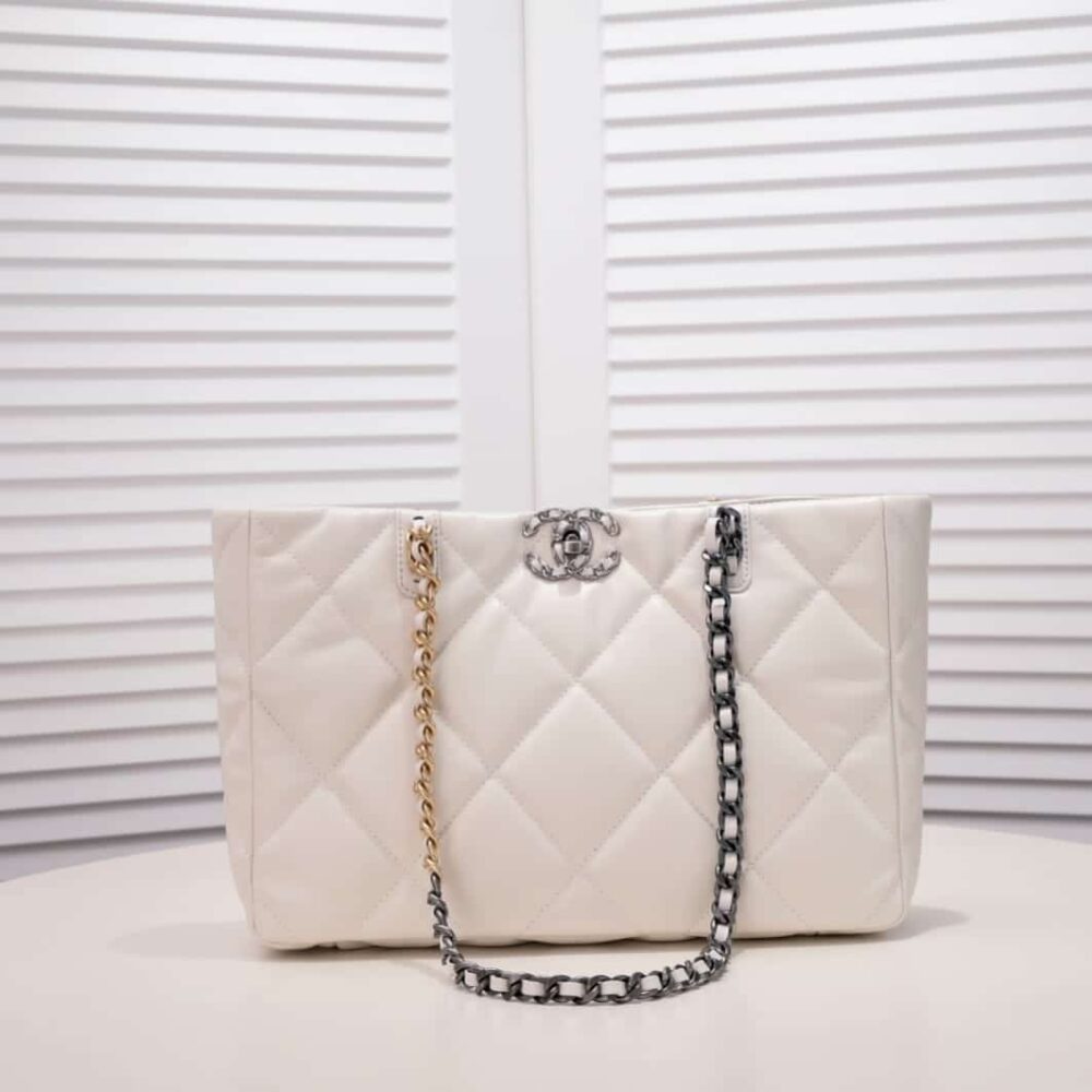 The Chanel Quilted 19 East West Shopping Bag in white captures timeless elegance with a modern, elongated silhouette adorned by signature quilting and delicate chain detailing. A symbol of effortless sophistication, it elevates every look with prestige and iconic allure, affirming your refined sense of style.