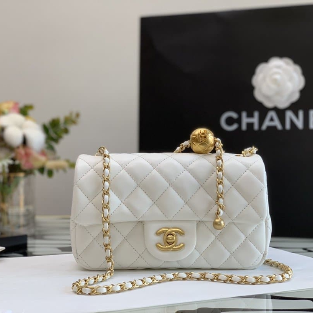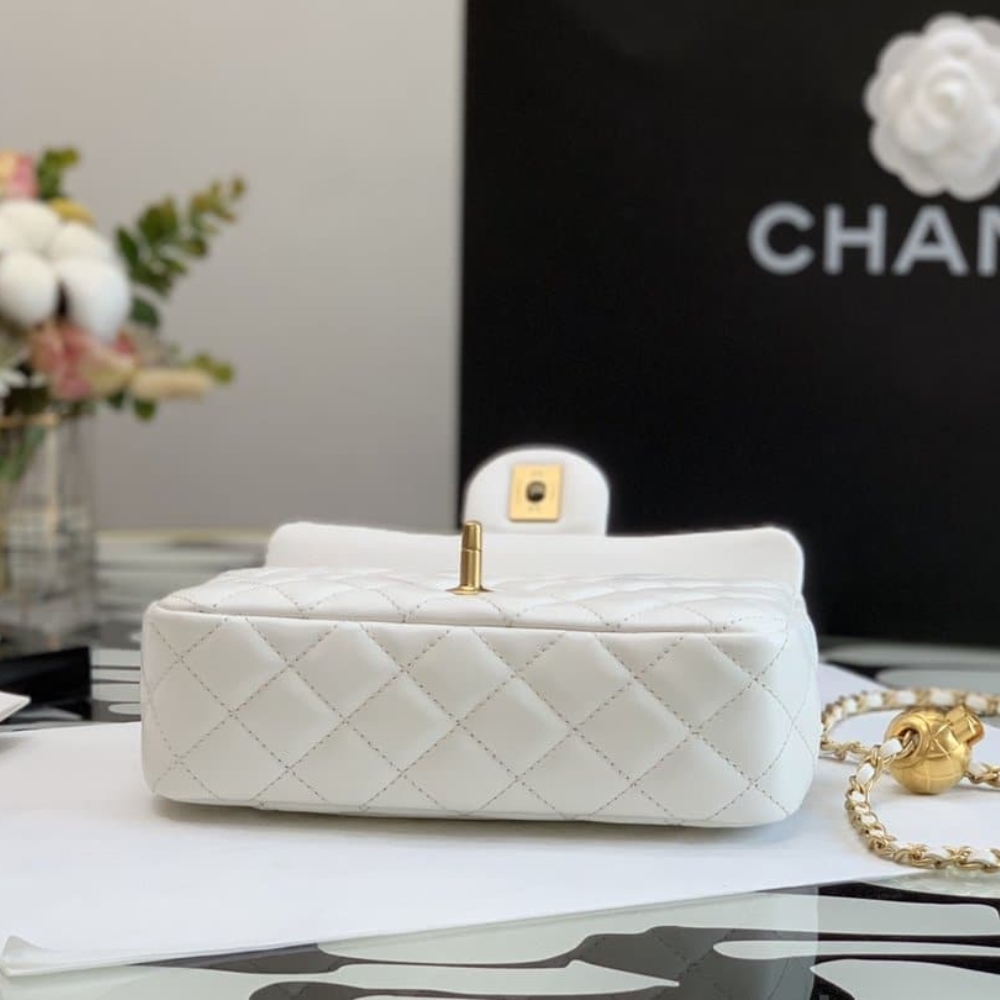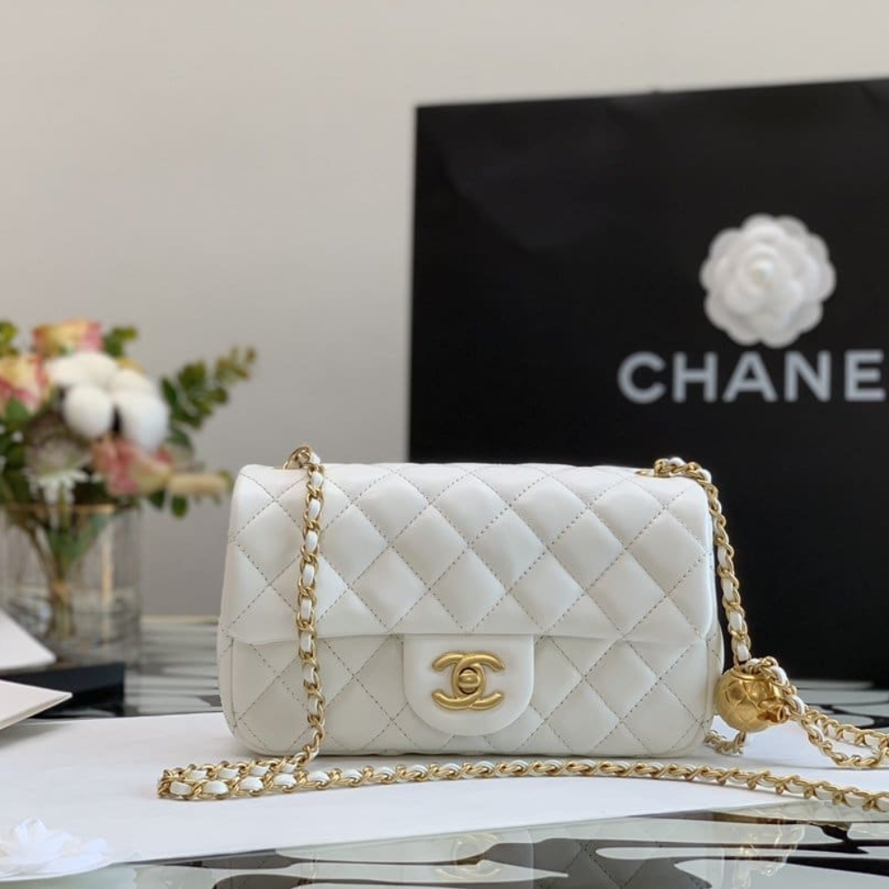 The Chanel Quilted Mini CC Pearl Crush Rectangular Flap White is a chic mini bag crafted in soft quilted leather with a rectangular silhouette. It features the signature CC turn-lock closure and a unique adjustable pearl-accented chain. A timeless piece that adds elegance and versatility to any look.