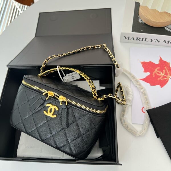 The Chanel Small Vanity Case SS22 Black captures the essence of timeless chic with its sleek silhouette and refined quilting. Embellished with the signature CC and polished accents, it radiates elegance and prestige, making it the ultimate symbol of elevated style.
