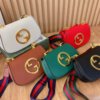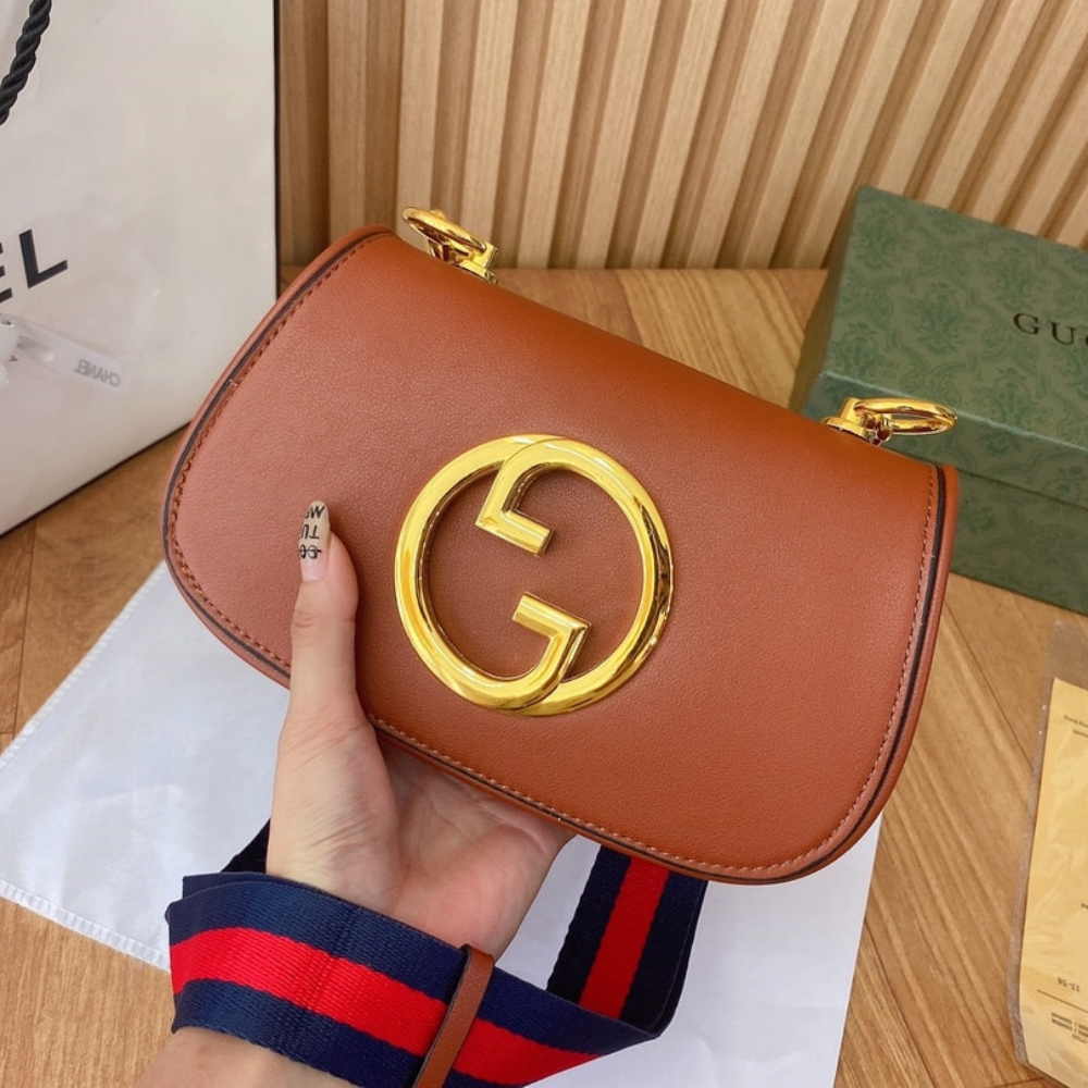 This is a Gucci Blondie shoulder bag in brown leather. It features the iconic round interlocking GG gold-tone hardware on the front and comes with a detachable green-red-green web strap, giving it a versatile styling option for both casual and elegant looks.
