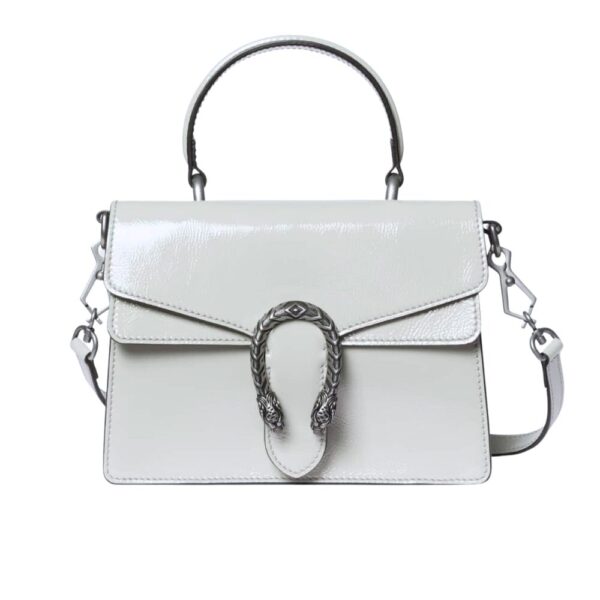 The Gucci Dionysus Top Handle Bag in white radiates pure elegance with its sleek lines and iconic tiger-head closure. A symbol of modern prestige, it embodies sophistication and power, elevating every look with luminous allure.