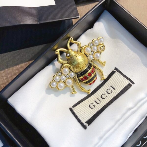 Gucci GG Black And Red Bee Brooch Gold With Pearl