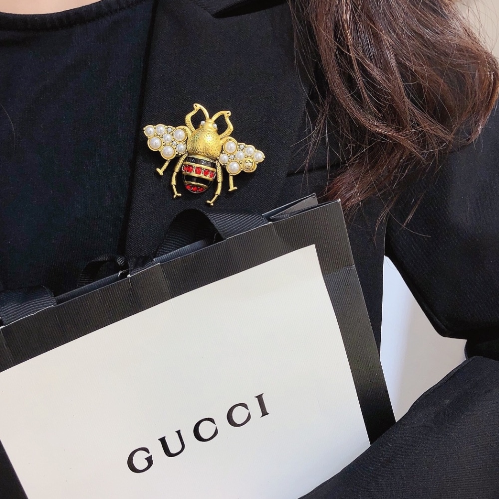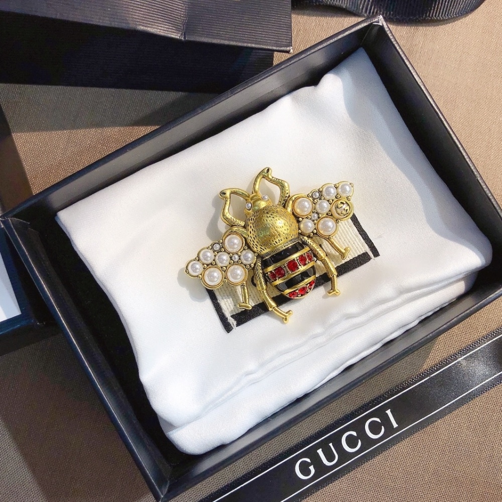 Gucci GG Black And Red Bee Brooch Gold With Pearl