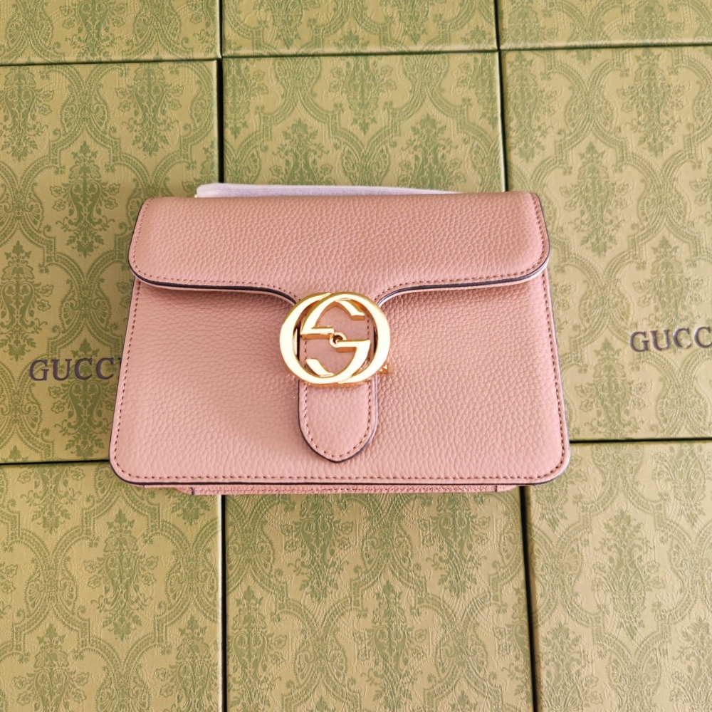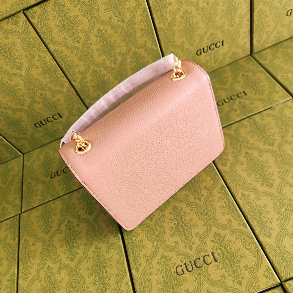 This is a chic shoulder bag from in a soft blush pink shade, offering a feminine yet sophisticated charm. The design features a structured silhouette with a flap closure, highlighted by the iconic interlocking GG logo in gold-tone hardware. Its chain strap adds versatility, allowing it to be worn elegantly over the shoulder or crossbody.