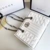 This is a Gucci GG Marmont tote bag in white. It features a diamond-quilted design with the signature interlocking GG logo in silver-tone hardware. The bag is completed with chain-and-leather shoulder straps for a chic finish.