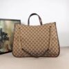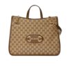Gucci Horsebit Tote Bag made of beige GG canvas with dark brown leather trim and gold-tone details. It can be carried by hand or over the shoulder. The top of the bag is open and features a zippered compartment and a slip pocket on the inside.