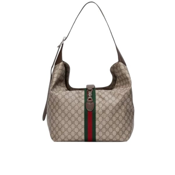 Embrace sophistication with the JACKIE 1961 Medium Shoulder Bag, a timeless accessory crafted in a harmonious blend of beige and ebony GG Supreme fabric. Functional yet stylish, it features a front plunger fastening and a detachable internal pouch, ensuring your essentials are both secure and effortlessly organized.