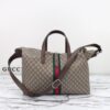 This Gucci duffle bag is crafted from GG Supreme canvas. It features a top handle, adjustable shoulder strap, turn lock closure, and a detachable pouch. The bag also includes a green and red stripe detail and the iconic Gucci logo.