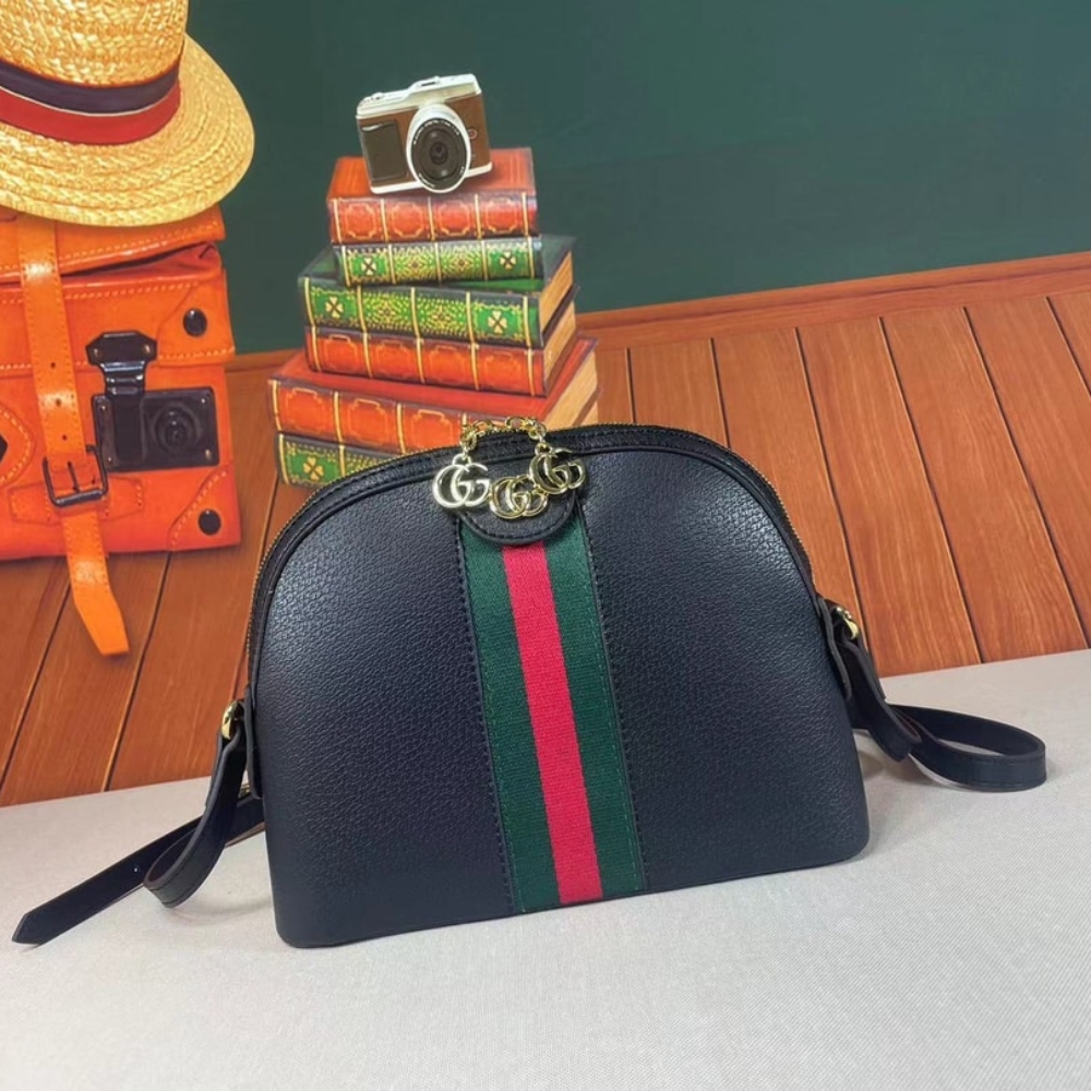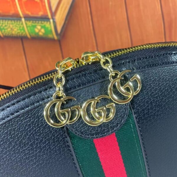 This is the Gucci Ophidia GG Small Shoulder Bag in black with the iconic green-red-green Web stripe and Double G emblem. Its sleek dome silhouette and structured elegance radiate timeless prestige, making it a refined companion that elevates both day and evening looks with effortless luxury.