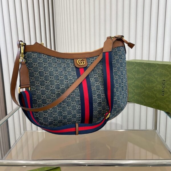 The Gucci Ophidia Jumbo GG Denim Hobo Bag blends laid-back sophistication with heritage detail. Its relaxed silhouette, highlighted by the iconic Web stripe and Double G emblem, exudes effortless elegance and modern versatility.