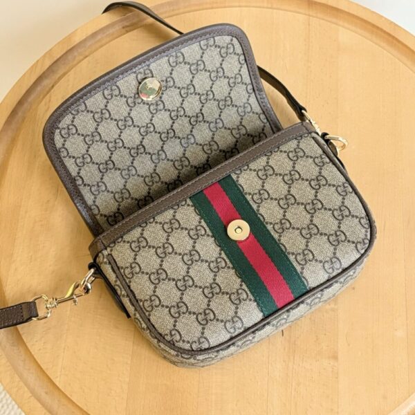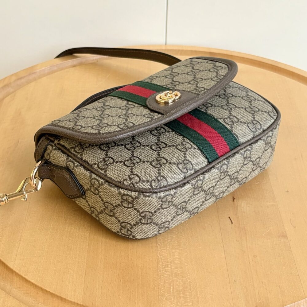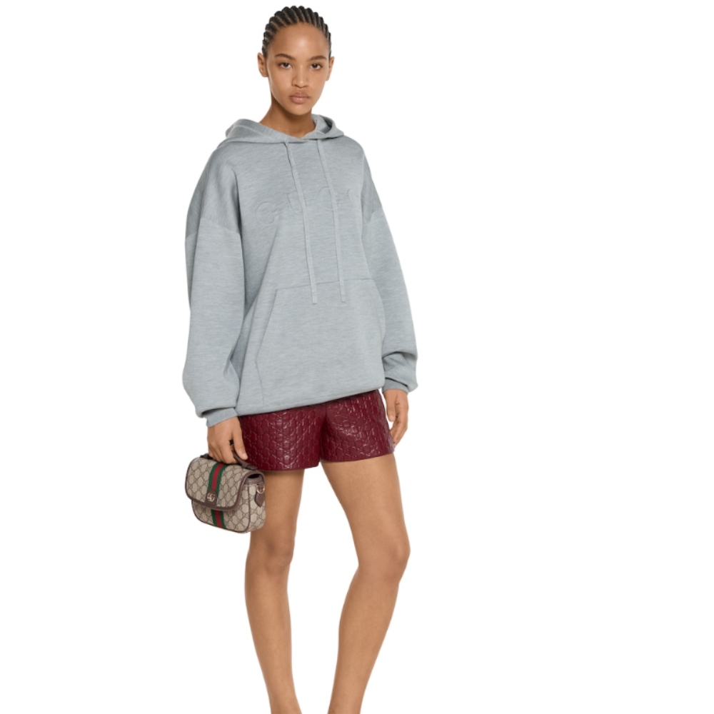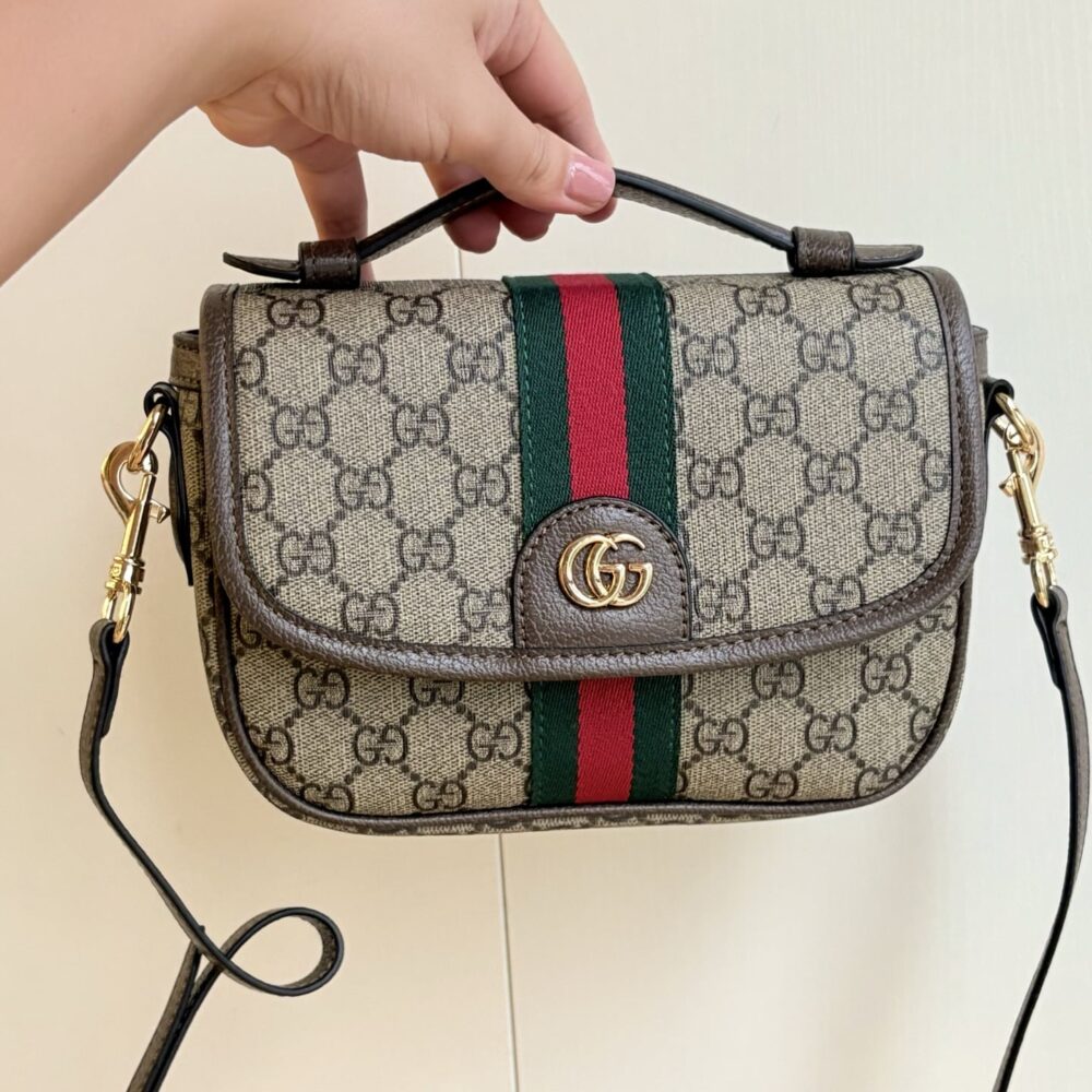 The Ophidia collection evokes the House’s heritage with the signature Web stripe and Double G emblem in light gold-toned finish. The styles are crafted from soft GG Monogram coated fabric, featuring green cotton lining inside.
