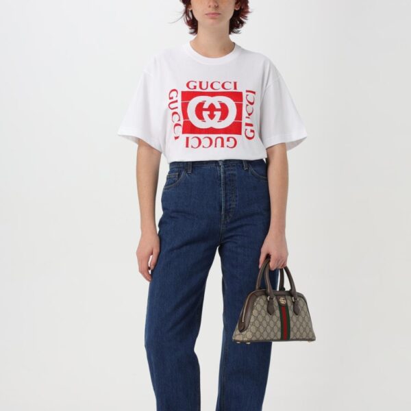 Small Ophidia handbag in beige and ebony GG Supreme fabric with brown leather trims and green and red Web. It features Double G in gold-tone metal on the front, adjustable and detachable shoulder strap, two-way zip closure, one main interior compartment and one interior open pocket.