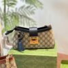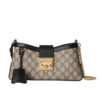 The Gucci Padlock shoulder bag features the signature gold-tone padlock closure, a chain strap, and a black leather key holder detail. A timeless design blending Gucci’s iconic monogram canvas with elegant black accents.