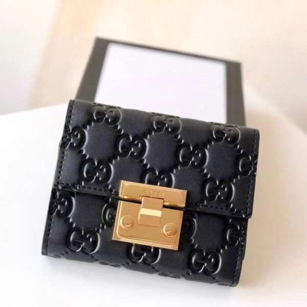 This is a Gucci Padlock wallet in black leather. It features the iconic GG embossed pattern throughout and a gold-tone push-lock closure, giving it a sleek and secure design.