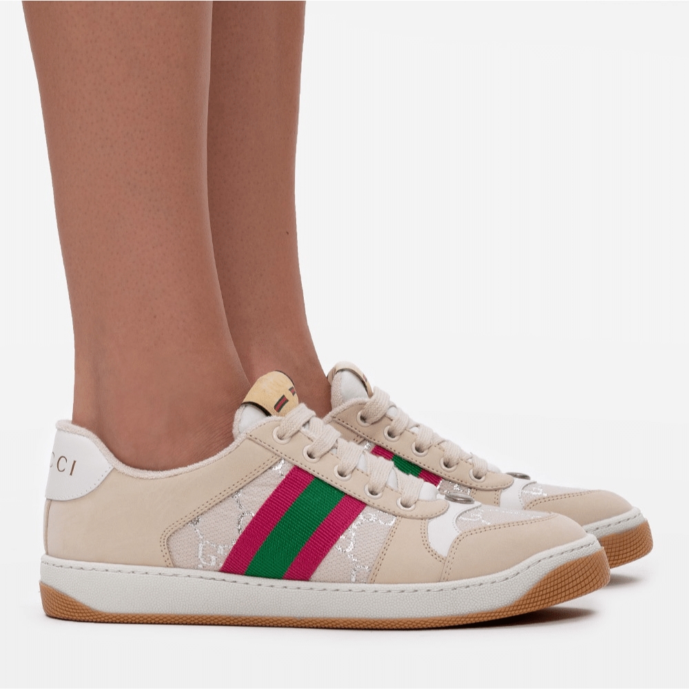 The Gucci WMNS Screener White GG Lamé captures vintage allure with iconic design lines and a modern twist of vibrant detailing. Radiating effortless elegance and comfort, it affirms your prestige while turning every step into a statement of timeless luxury style.