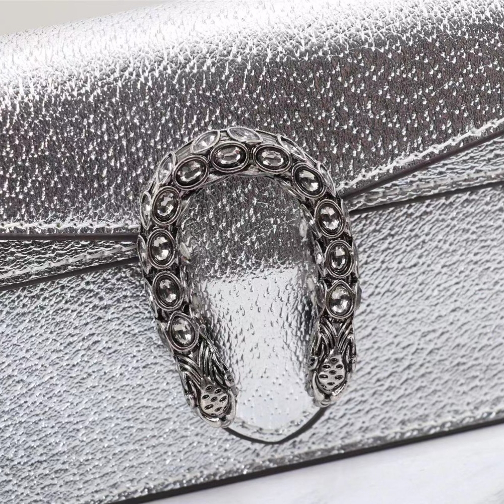 Gucci Women Dionysus Super Mini Crossbody Bag Silver 16Cm 476432 1TRBN 8173 dazzles with its luminous sheen and signature tiger-head clasp, capturing the essence of modern glamour. Radiating an air of effortless prestige, it turns every appearance into a statement of bold, radiant sophistication.
