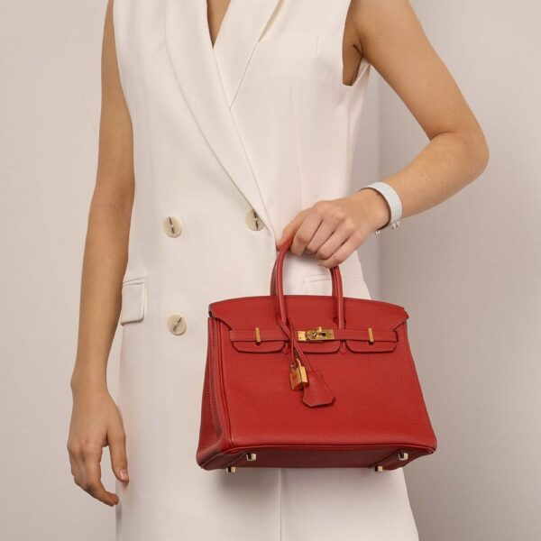 The Hermès Birkin 25 in Togo Rouge Vermillon dazzles with its striking red hue, supple grained leather, and radiant gold hardware. A timeless icon of power and prestige, it embodies the essence of luxury for those who embrace elegance with bold sophistication.