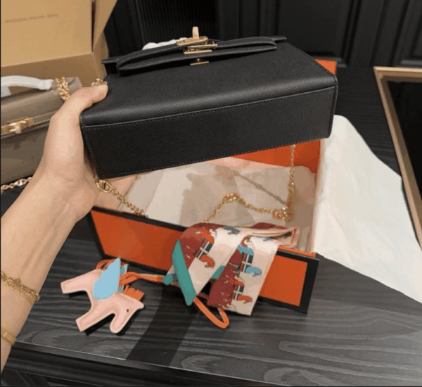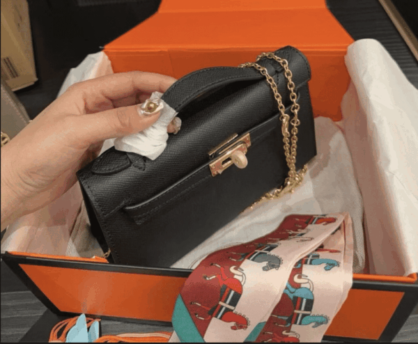 The Hermès Kelly Mini in black with gold accents embodies pure sophistication, with its sleek silhouette and timeless design lines radiating elegance. A symbol of prestige and refined luxury, it is the ultimate statement piece for those who command style with effortless grace.
