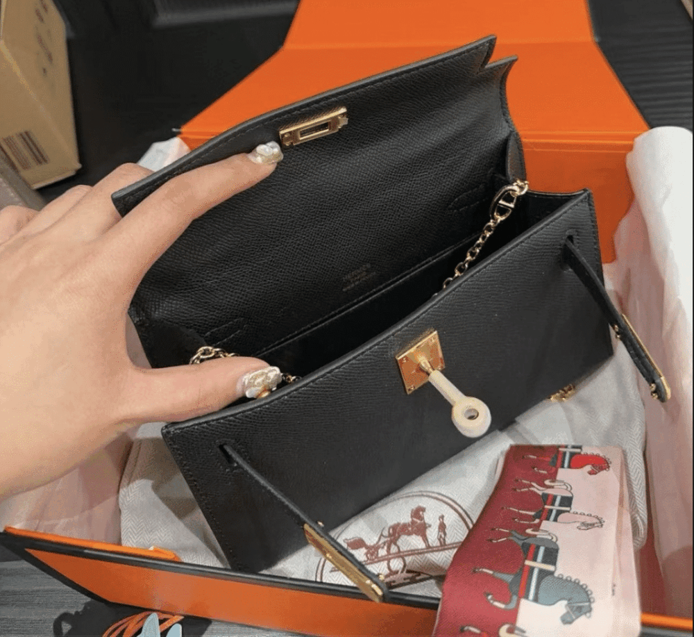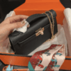 The Hermès Kelly Mini in black with gold accents embodies pure sophistication, with its sleek silhouette and timeless design lines radiating elegance. A symbol of prestige and refined luxury, it is the ultimate statement piece for those who command style with effortless grace.