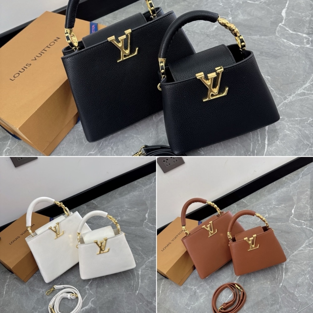 The Louis Vuitton Capucines BB is a versatile shoulder bag crafted from leather in a classic black color. It features a magnetic snap closure and is adorned with gold-tone hardware. The bag includes a zippered pocket for organization and has an adjustable shoulder strap.
