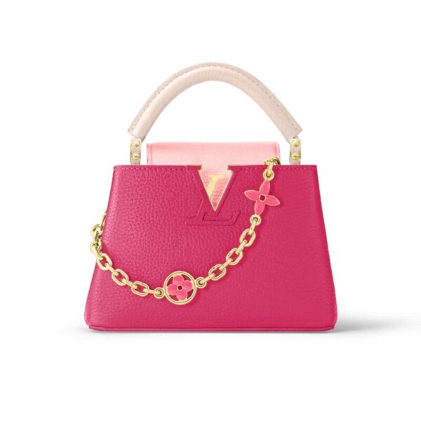 This very feminine Capucines Mini bag is made from leather with light pink on the flap and top handle. It features a gold-colour chain decorated with enamel Monogram Flowers for shoulder carry as well as a detachable, thin leather strap for cross-body and shoulder wear.