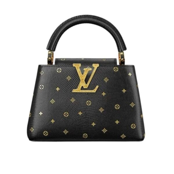 The Capucines Mini bag exudes romance with hand-painted enameled floral details. The design celebrates the house’s craftsmanship leather and a gold-tone LV logo. It protects everyday essentials while allowing for more room inside and can be worn in a variety of ways.