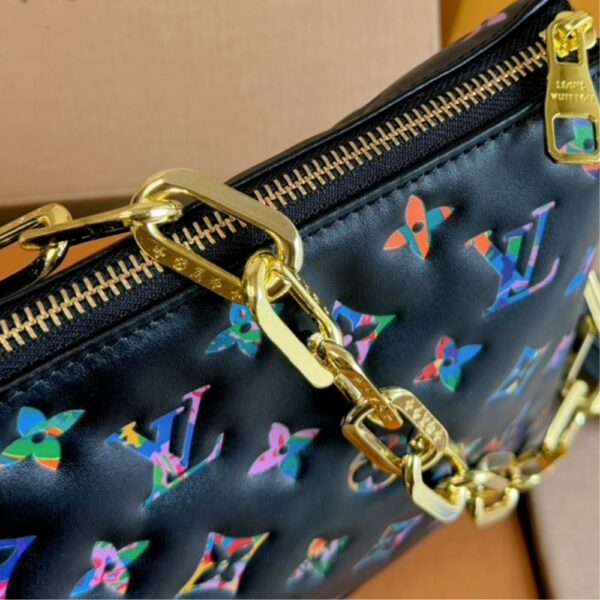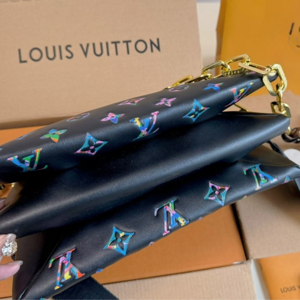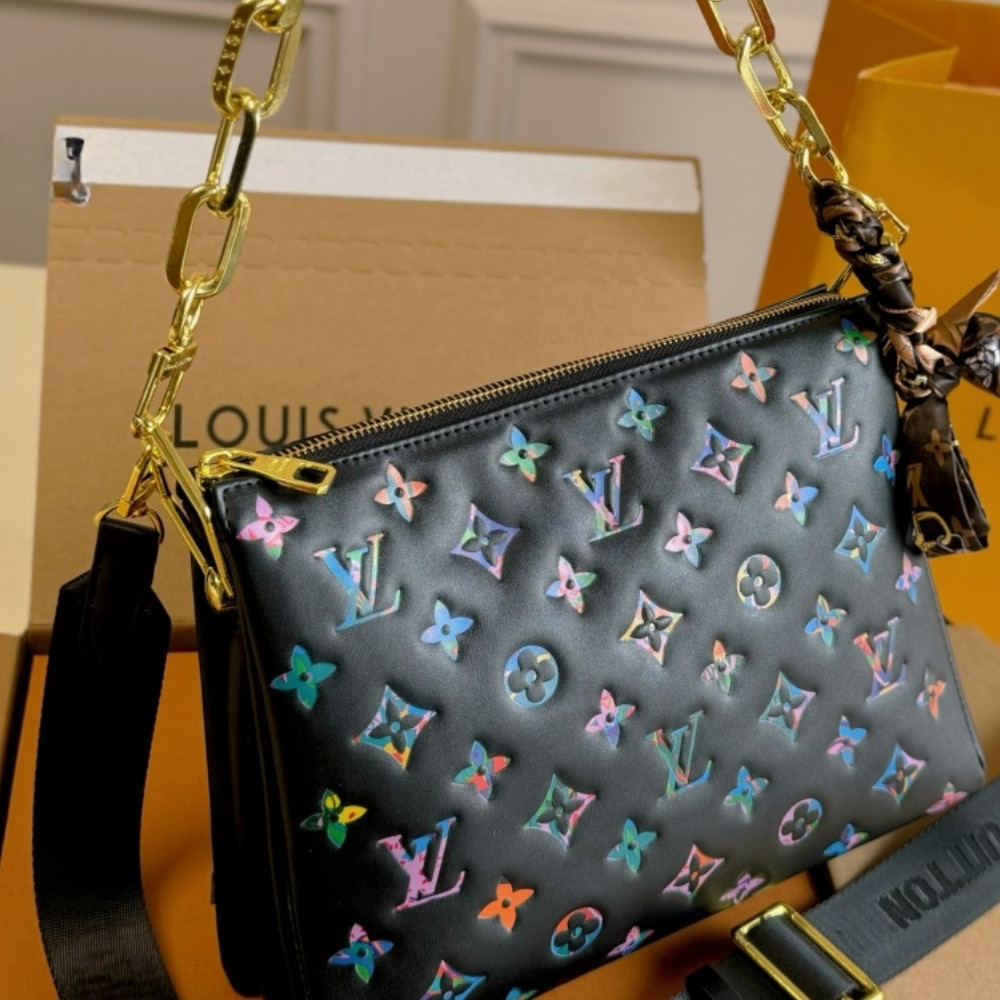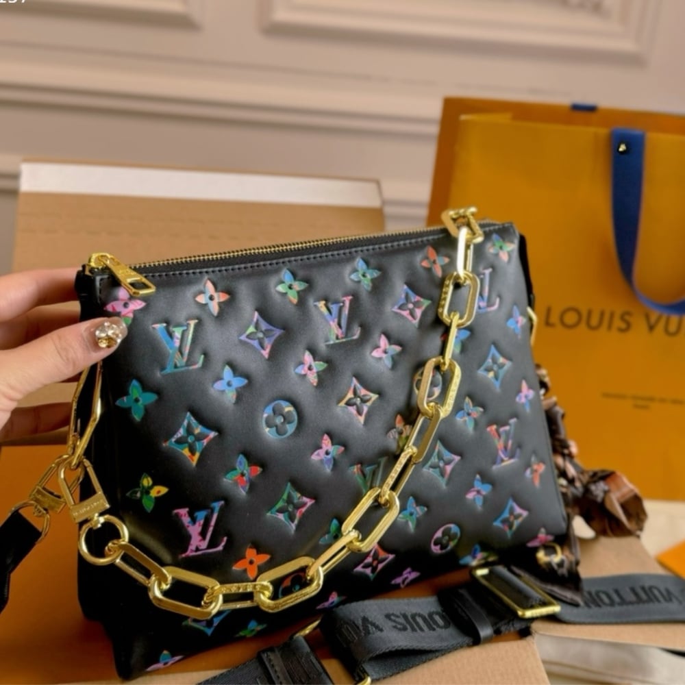 This Coussin PM bag is an embossed LV Garden monogram motif. It can be worn crossbody using the strap, over the shoulder using the short chain, or comfortably under the arm. This model lends an avant-garde look to even the most pared-down ensembles. This luxury crossbody bag is part of Louis Vuitton’s “LV Garden” capsule for fall-winter.