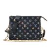 Louis Vuitton Black Embossed Multicolor Floral Monogram Coussin MM Bag. Features adjustable canvas strap allowing for crossbody or shoulder carry, and chain strap for baguette and under-arm carry.