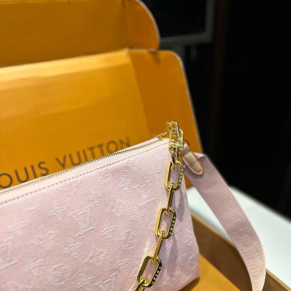 A statement addition to the Coussin line, this PM model showcases the revival of the House’s 2005 Monogram Denim pattern. It is crafted from organic cotton, which is artfully woven on a white base to create a luminous pink finish. The signature chunky LV chain is removable, offering multiple carry options.