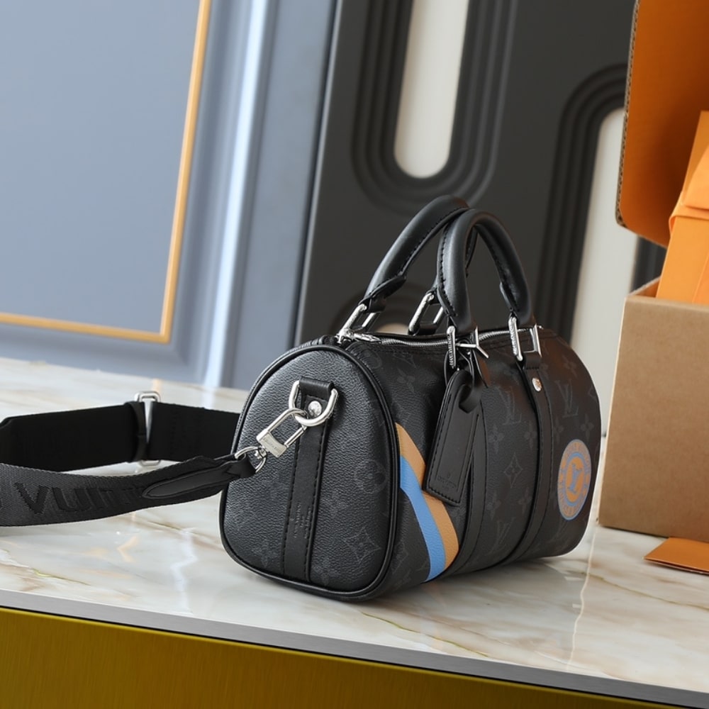 The compact Keepall 25 bag in Monogram Eclipse canvas is part of the Mon Monogram. The stylish Keepall features two leather side bands and a leather name tag. A removable and adjustable strap gives carry options.