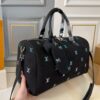 Crafted from the unique LV Blason Denim, the Speedy Bandoulière 40 is a fusion of musical inspiration and the fashion language of Creative Director Pharrell Williams. On the black Denim fabric are intricately embroidered LV logos with a gradient effect, combined with headphone accessories and a leather name tag, both of which are easily removable.
