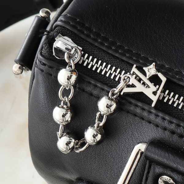 Pharrell Williams crafts the Keepall Cargo Bandoulière 25 for a city bag with an understated elegance that incarnates Williams’ dandy aesthetic. The main zipper features a zip-pull connected to an LV Initials charm. The bag is signed with a “Louis Vuitton Paris patch” attached to the leather with two pearl rivets.