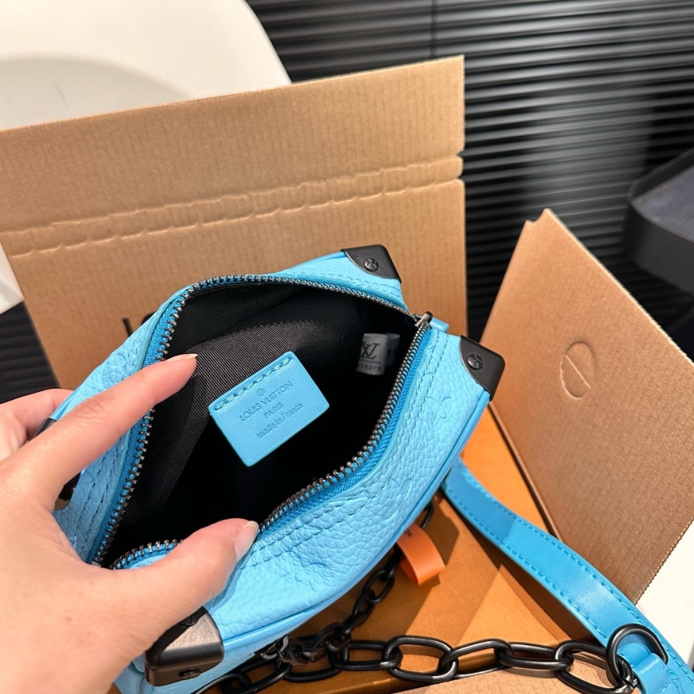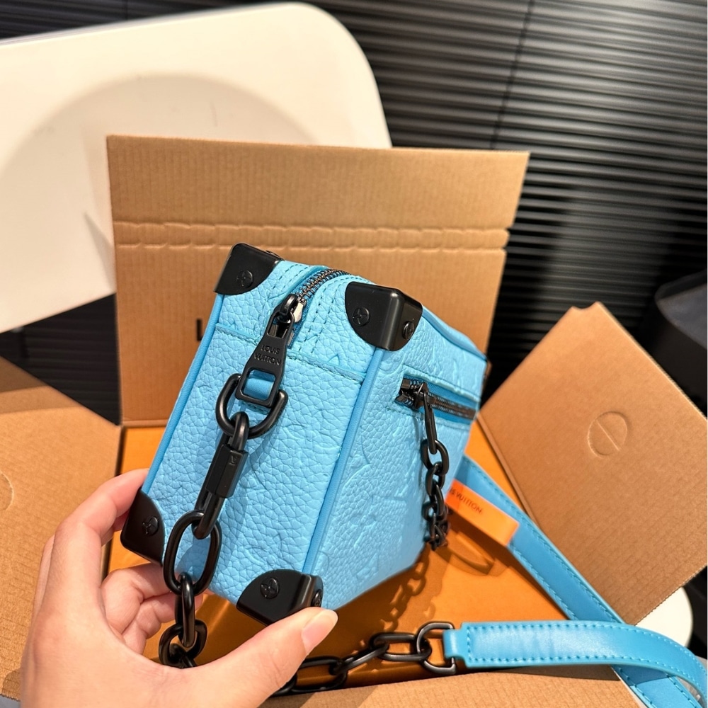 A vibrant turquoise colorway and black-color hardware gives this Mini Soft Trunk bag a fashionable feel. The reinforced corners, chain detail on the front, and adjustable chain strap, all in graphic matte-black, anchor the bag in Louis Vuitton’s heritage.