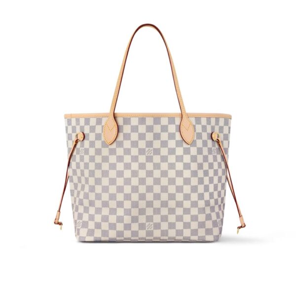 The Neverfull MM large bag blends timeless design with details drawn from the House’s heritage. Crafted from Damier Azur fabric and trimmed with genuine leather, the bag’s generous, elegant, and minimalist silhouette is complemented by side straps that can be tightened for a slim silhouette or left untied for a contemporary, chic look. The slim leather handles can be easily carried over the shoulder or by hand. The bag features a colorful lining and a removable pouch that can be used as a clutch or as an additional pocket.