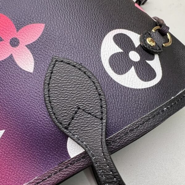 This summery Neverfull MM tote bag is made from Monogram Giant canvas in a gradient pastel colorway and is accessorized with a leather flower charm. The bag’s side laces tighten for a sleek silhouette or loosen for a more casual look. Its interior pouch can be removed and carried used as a clutch while its thin handles slip comfortably over the shoulder or arm.