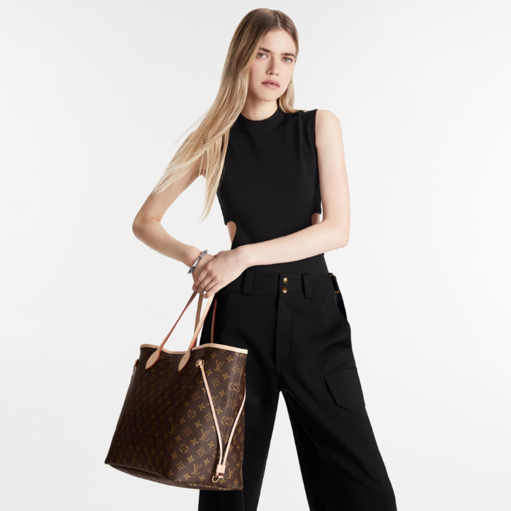 The Neverfull GM tote unites timeless design with heritage details. Made from supple Monogram canvas with trim, it is ultra-roomy but never bulky, with side laces that cinch for a sleek allure or loosen for a more casual look. Slim, comfortable handles slip easily over the shoulder or arm. Lined in colorful textile, it features a removable pouch which can serve as a clutch or an extra pocket.