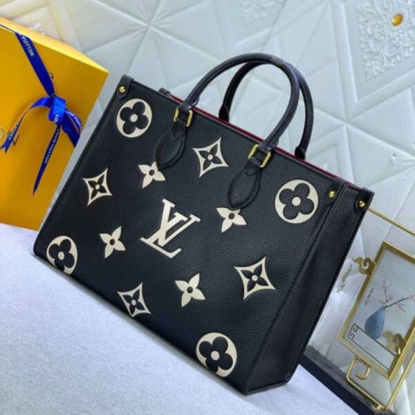 Made from Monogram Empreinte grained leather in a warm two-colour combination, this OnTheGo MM tote bag features the Monogram pattern embossed and printed onto the leather. Its boxy shape means it is roomy and can easily fit a laptop. It has two leather top handles for hand carry as well as two long shoulder straps.