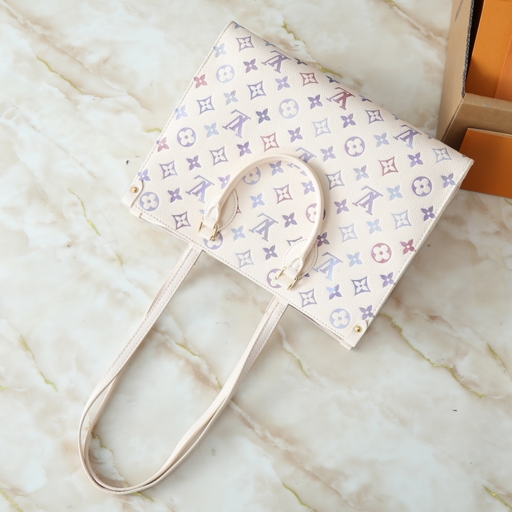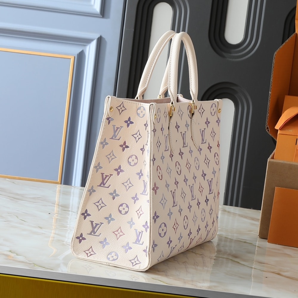 Reimagined for the House’s Dream animation, this OnTheGo MM tote is an elegant everyday companion. It is crafted from Monogram Empreinte leather decorated with a unique digital printing technique to create a watercolor gradient. The style is finished with light gold-toned hardware and includes multiple pockets to store everyday essentials. Attach the longer strap to wear it cross-body.