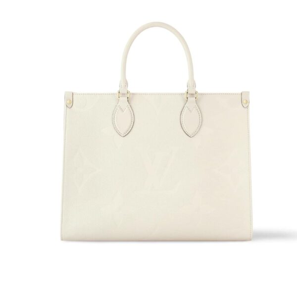 The OnTheGo MM bag looks stunning in cream Monogram Empreinte leather, accented with a matching Microfiber lining. The embossed Monogram pattern on the grained leather gives the bag an elegant look. It has space for a laptop, combined with a rolled leather handle and two long straps for flexible carrying options.