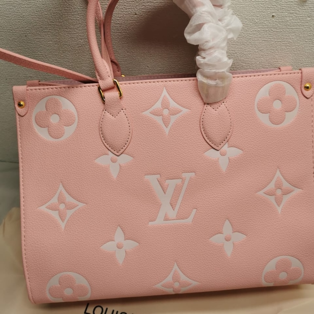 This OnTheGo MM tote bag is made from Monogram Enpreinte leather, with the Monogram Flowers and LVs in a cream color, embossed then printed on a pink background. Lined in a matching greige, this carryall is perfect for work or weekend. The OnTheGo offers both articulated top handles and long shoulder straps.