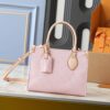 The bag Onthego PM Pink Denim is described as being made from durable canvas material with genuine leather handles, offering a comfortable and elegant carrying experience. It features a spacious interior and multiple pockets for organization, making it suitable for daily essentials.The design is a crossbody tote style, suggesting versatility for different carrying preferences.