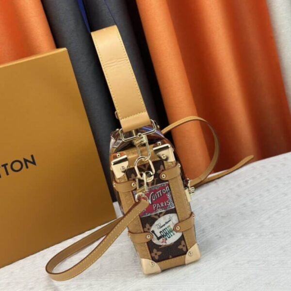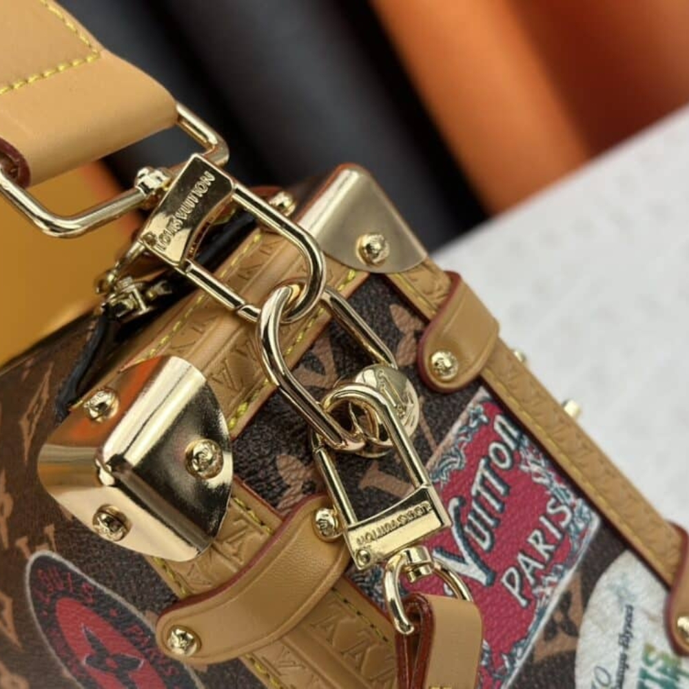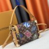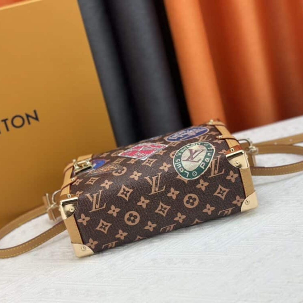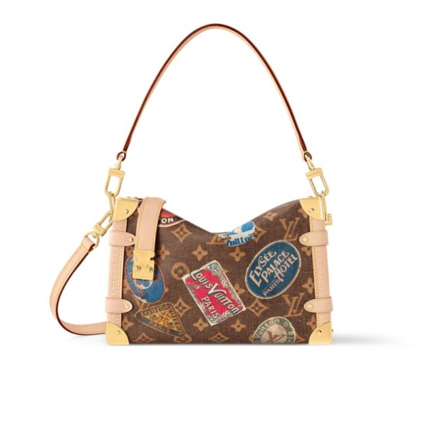 From the Spring-Summer 2024 show comes this Side Trunk MM handbag. It is inspired by the Maison’s archive-trunk Monogram canvas, made of a blend of cotton and linen glazed with resin for a superbly soft hand. Decorated with hotel labels that pay tribute to Gaston-Louis Vuitton’s fabulous collection. Both handle and strap are removable.