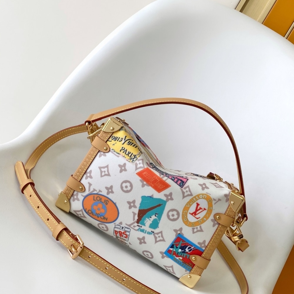 Part of the Flight Mode collection, this Side Trunk MM is offered in Monogram Dune canvas, reimagined with a vintage-inspired finish. The lightweight design is decorated with playful labels in a patchwork effect and is elevated with gold-toned hardware. The iconic natural leather trimmings pay tribute to the House’s trunk-making heritage.