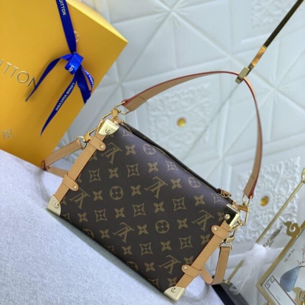 The rectangular PM Side Trunk is crafted from Monogram Canvas, gold-tone metal details. The reinforced corners and S-lock closure are inspired by classic Louis Vuitton trunks. The bag can be carried as a handbag or on the shoulder thanks to the removable and adjustable leather strap.